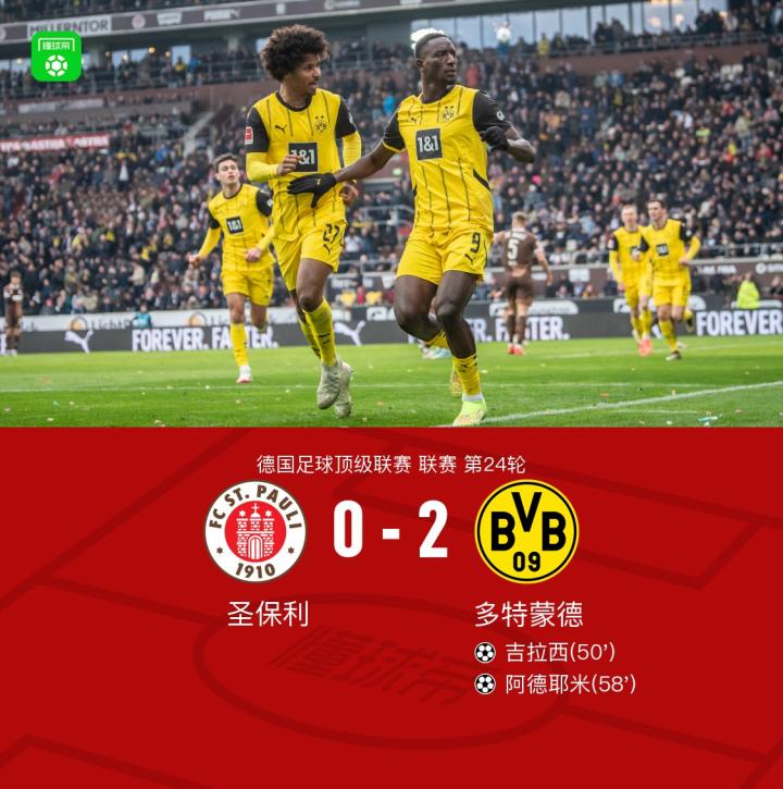 本场比赛是德国足球甲级联赛第24轮,多特蒙德客场挑战圣保利。上半场比赛,双方表现平稳,没有太多出色的进攻机会。然而,下半场比赛开始后,多特蒙德便快速找到了进球的机会。第50分钟,吉拉西在门前抢射破门,为球队打破僵局,将比分改写为1-0,为多特蒙德取得领先。